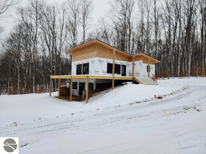 Opportunity knocks for the lucky buyer who can finish this darling, contemporary home in a lovely elevated, serene setting between NP and Omena! Being sold "As Is" (approx 50% finished), an unfinished shell w/ 971 square feet approx. on each level, Anderson windows, 14' sloped ceiling, metal roof, 2 X 6 construction, gas fireplace on site, some building materials, 12' deep decking, walk out lower level, and 90+ Goodman furnace comes with. The hard work is done as the well, septic U/G electric and driveway are in, all done right with local builder at the helm of this job. Area off the driveway at the bottom for an outbuilding, this is easy! Finish this to your taste, and the layout can be as you choose, so suit yourself! Countryside views and a peek a boo of the Bay in the distance! 2 bd, 1.5 ba septic installed.Gravel to the power box at the top of the hill then dirt.