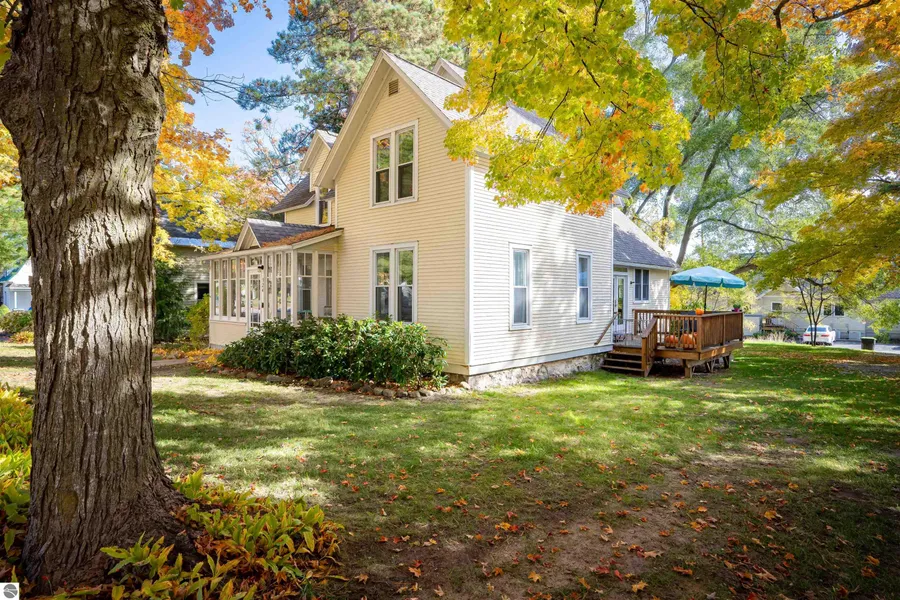 Premium Village Location on a spacious 80' wide lot. This house lives large with a family room, living room on the main floor + a den, lovely Lattimore designed stone f/p, and new roof 2014. This was remodelled in 1998 down to the studs, added on to, w/ drywall / updated electrical - very....hard to come by in the Village! Local builder Pete Leabo Jr did the updates, wood floors, large open kitchen with dining area, front porch, master suite with private master bath (try to find that in downtown Suttons Bay)! Build a large garage with alley entrance & this is the preferred access in the Village. Year round home, 4 bedrooms / 3 baths, large yard, located in the heart of the Village, walk to absolutely everything: Destination dining, shopping, Bay Theater, houses of worship, school, Herman Park incl. dog park, tennis & pickelball courts, beaches, boat launches, farmers market, Leelanau Tra...