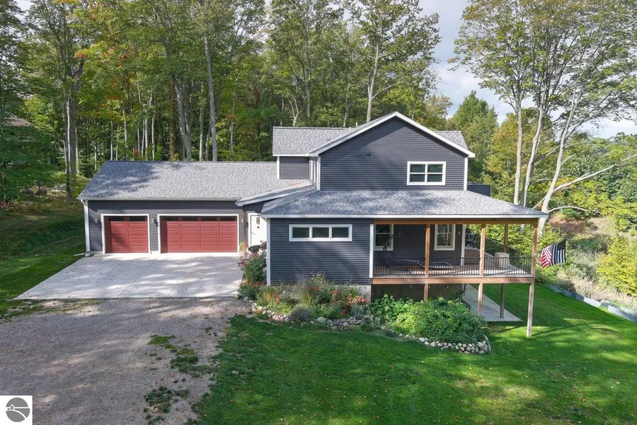 So much to love about this custom-built home just outside the Village limits with inspiring year-round Suttons Bay views! This picture-perfect home is framed by 4 acres to enjoy the privacy, with quality finishes throughout, an oversized garage w/ 3 car/doors & extra depth, a large, poured concrete apron in front of the house & garage. Quality materials are in evidence throughout, in this well thought out floor plan w/ room for expansion. Open kitchen & dining area features barn doors to close off if desired, quartz & butcherblock countertops, newer convection double ovens w/air fryer/slow cooker, multiple functions, pantry, & waterproof COREtec flooring (LVP). Note the main floor bd, wrap around deck, extensive storage areas, mudroom spectacular views from every room. The upper level en-suites share a loft space and balcony for bay & star gazing. Features include high ceilings, ope...
