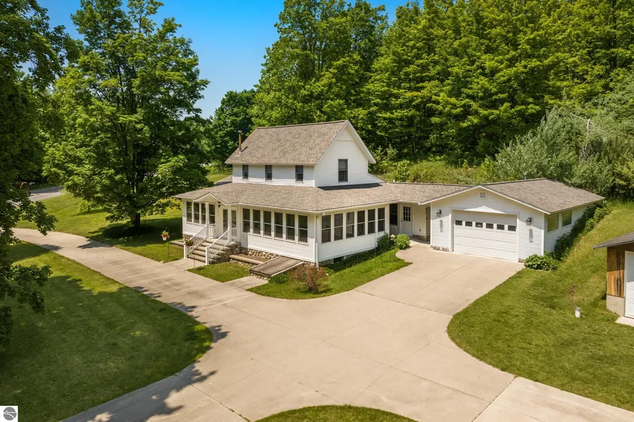 Step into this beautiful modern farmhouse, where comfort, style, and elegance come together seamlessly. A wraparound four-season porch warmly welcomes you, captivating the tone for this one-of-a-kind gem in Leelanau County. This exceptional home has a spacious primary suite featuring cathedral ceilings, bay windows, secondary laundry area, and French doors that lead to a cozy front deck. The suite includes a generous walk-in closet with built-ins and a large en-suite bath already plumbed for a roll-in shower, ready for your finishing touches. With its size and layout, it could easily be converted into two separate bedrooms with bathrooms and private entrances. A beautifully crafted staircase takes you upstairs where you'll find a bright bedroom with a third full bath and roomy storage area, perfect for a home office, nursery, or creative studio. The island kitchen is a dream for any cooking enthusiast, offering a built-in pantry, cook stop stove, and wall oven. The adjoining dining area has elegant built-in shelving and ample room for gatherings. Walk outside from the kitchen to an expansive concrete patio with a thoughtfully designed retaining wall showcasing raised planting beds with natural butterfly gardens, ideal for entertaining or enjoying quiet moments in nature. This home has seen numerous enhancements including a new roof. The heated two car garage offers abundant shelving, work benches, and storage drawers. Beyond the garage, the large barn provides four storage areas with one area being remodeled and enough space for storing a car or boat. Nestled in a quiet and picturesque location, this amazing home is just a short drive to downtown Suttons Bay, Lake Leelanau, and Leland. Enjoy a selection of wineries or take a leisurely stroll over to Tandem Ciders. For outdoor enthusiast, the nearby Tart Trail offers a scenic route for walking and biking. Don't miss this rare opportunity to own a meticulously maintained home in one of Michigan's most desired regions.