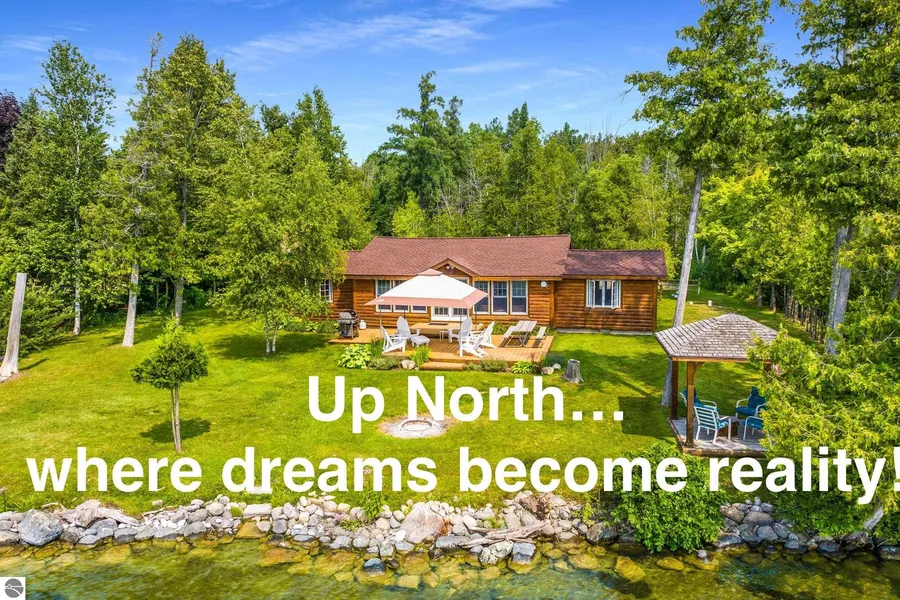 The ultimate western shore setting on S Lake Leelanau complete with dock, hoists and water toys! This is the ultimate turn key package! Wake up to Sunrise views and enjoy 120' of hard sand frontage, gorgeous outdoor lakeside entertaining areas with composite decking, including a canopy for shade, & a sheltered gazebo area. Simply no reason not to be outside! Enjoy Up North log cottage charm w/ t & g wood walls, doors & ceilings, open floor plan, wall to wall views, 3 bd, 2 ba, & gas stove for winter enjoyment! Detached garage with a bunkhouse & bath for overflow guest quarters. Spacious sites with 1.58 acres AND a 30'x 40' pole barn for the boats, kayaks, paddleboards & more, no storage issues here! Come see what the buzz is all about on Lake Leelanau with 41 miles of shoreline to explore, on this spacious 8600 Acre lake! Enjoy endless fun w/ boating to Cedar, Lk Leelanau, Leland & the Tiki Bar to park & enjoy! So close to destination dining & shopping to enjoy our small town specialty businesses. This is where the fun begins & memories are made! Exclusions to Turn key are: the Whaler & trailer parked in the pole barn, water matt in the lake, clothing, bird in primary bd, personal photos (Hurricane deck boat & all other boats, kayaks, etc included). Great Rental too!