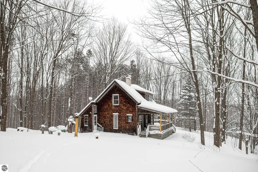 The beauty of a vision and a really big flatbed truck moved this circa 1900's granary building from a nearby farm to the growing Jackson family's 20 acres in central Leelanau County. A community then came together. Good friends, & sweat equity tag teamed to build this funky, eclectic, cottage on nearly 5 acres in the woods, where kids explored and roamed around the forest, parents gardened & created their art. Family memories were created. Exposed hand hewn post & beam frame is a testament to longevity, maple floors to durability, & the artistic use of wood, steel, & masonry to craft. Main level primary bedroom, two bedrooms on the upper level share the only bathroom. Time to create your own vision with imagination, a budget, and money well spent, to make this unique abode your special home. Large 9'x28' covered porch will be a welcomed spot for sipping coffee, enjoying the vast views of peaceful, rolling hills. A chicken coop adorned with repurposed building materials could be resurrected for producing hen fruit, maybe a studio, or a she shed. The added underground root cellar might serve in tandem as a place to keep precious wine. The 24x30 detached garage/workshop has lots of utility, but will need some attention. Certainly this gem is a fixer upper, but well worth the effort, to reawaken and create your own memories of kids sledding and tree climbing. A private driveway is shared with 2 other residences. An informal agreement is in place to share in snow removal/maintenance costs at this point, something more formal is possible. Point-of-sale waiver for a water analysis may be likely as the supply lines have been compromised due to improper winterization. Septic was pumped in 2020, and has not had much use since. Yard art and some items from the work shop/garage to be removed, but may need to happen after a sale. This is a one-of-a-kind property. Given the interest, highest and best offers will be reviewed after 4:00 PM 2/12/26.