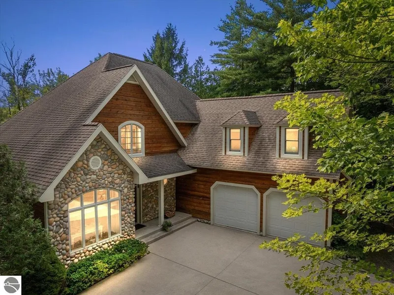 Experience lakeside living at its finest with this exceptional custom home featuring 200 feet of pristine frontage on the Narrows of North Lake Leelanau. Cultured stone and cedar shiplap siding create timeless curb appeal, while extensive decking, walkways, and two quality permanent docks provide effortless access to the water. A treetop veranda offers a unique perch to relax and take in the sweeping views. Inside, this 4-bedroom, 2.5-bath residence spans 3,390 sq. ft. of thoughtfully designed living space. Soaring vaulted ceilings, above-average ceiling heights, and expansive windows fill the home with natural light and frame breathtaking views from nearly every room. The great room is anchored by a true stone fireplace, complemented by forced-air heating, central air, and premium EPS insulation for year-round comfort and efficiency. The lakeside owner’s suite includes a spacious privat...