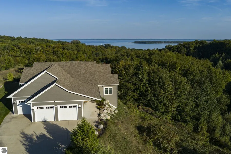 Wake up to breathtaking sunrises over the Bay in this beautiful 3-bedroom, 2.75-bath home, perfectly positioned to overlook the scenic Stony Point and Old Mission Peninsulas. Thoughtfully designed with both comfort and character, this home features a spacious kitchen with abundant cabinetry, engineered quartz countertops, and a one-of-a-kind island topped with repurposed bowling alley flooring, ideal for entertaining or everyday living. Soaring vaulted ceilings and a high-efficiency wood-burning fireplace create a warm, inviting living space. The primary suite boasts a beautifully tiled walk-in shower and spacious walk-through closet. An added bonus is the 3-season porch with pine ceiling, perfect for enjoying the changing seasons. Luxury vinyl plank (LVP) flooring flows through the main living areas and second bedroom, offering durability and style. Additional features include LP Smar...