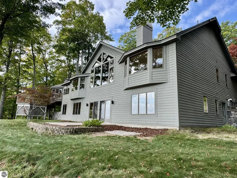 Enjoy breathtaking, 180-degree Bay views over Old Mission Peninsula and beyond from this beautifully designed 4-bedroom, 3.5-bath ranch home. With over 3,600 finished square feet, this home offers generous living spaces, soaring 17-foot cathedral ceilings, and expansive windows that flood the interior with natural light and frame the stunning Bay vistas. The open-concept layout includes spacious living room and family room, each with a cozy fireplace, perfect for entertaining or relaxing. The main level also features a dedicated den or home office, formal and informal dining areas, and two bedroom suites. The owner was in process of remodeling the kitchen and it is a blank slate, ready for buyer to add their own design & style. Bathrooms boast ceramic tile, vanities with granite countertops. Hardwood flooring flows throughout the main level, while the full walkout lower level includes in-floor radiant heat for year-round comfort. Additional highlights include 8-zone heating system, central air conditioning, a wooded, elevated lot offering privacy and natural beauty, built-in gazebo and waterside deck, shared West Bay water access just a short walk away. This exceptional home seamlessly combines comfort and unmatched Bay views, an ideal Northern Michigan retreat or year-round residence. Highest & best offers due Monday, October 6, 2025 at 5:00pm.