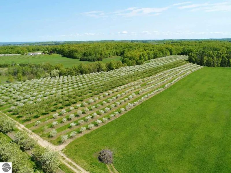 If your idea of a sound portfolio includes sweeping vistas, rolling hills, evergreen forests, and the soft, colorful splendor of cherry blossoms in springtime, then then look no further. Here in the heart of Leelanau is an uncommon opportunity to own more than a mile-long measure of paradise. There are one hundred and eighty-four acres, of which 58 acres are planted in tart cherries, and 5 acres are planted in sweet cherriesa total of 7,337 trees; the orchard is actively maintained and vineyard suitable. The property has been approved for a 78-unit residential site condominium project and it's situated amid the Leelanau Wine Trail.