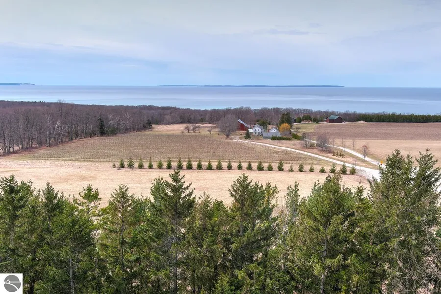 A majestic view of Lake Michigan and the Islands will greet you with surprise and awe. The location lies between Northport and Leland. The property is situated on a gravel road where its journey ends. The topography rises from the east, slopes and rises again to the west. The Morton building, completed in 1999, is 60' x 120' x 16', constructed with Hi-Rib panel steel, it has (3) 18'x 16' double end aluminum steel doors plus a slightly smaller steel side door; (3) cupolas, (9) vinyl windows with shutters, there's a 5? well and septic system. Underground power is installed and fiber internet is scheduled to come down the road summer 2022. Except for the office and bath, the building is not insulated. The property fronts Kelch Rd along the north side and Carlson Rd on both sides of the road. Old cherry trees were recently removed from the land along Carlson.