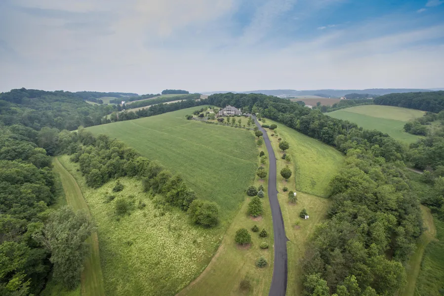 Deceivingly modest entrance takes you up a winding drive of manicured lawn, adorned with colorful plants and trees. Atop the hill sits the crowned jewel of these 54 acres, a custom 10,000 sq. ft. home lovingly built by its owner. First floor kitchen with custom cherry cabinets, granite counter tops, Viking appliances and endless custom features provides an open floor plan with living room, dining area, wood burning fireplace, beautiful millwork and tray ceilings. Formal dining room and living room complete entertainment space. A 14' ceiling master suite includes a large bath and soaking tub with beautiful views. Next floor provides 3 bedrooms with en-suite baths with balcony views of the patio, heated pool and fire pit. A walk out fully finished basement contains, kitchen, bar, fireplace, full bath, second laundry, gym, sauna, steam room and opens to outdoor kitchen. Entire house feature...