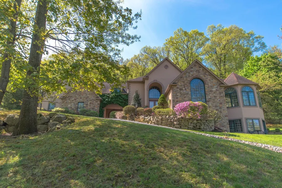 FABULOUS NEW PRICE. The past embellishes the present in the traditional elegance of this spectacular French Country Estate. A porte-cochere provides a touch of medieval romance and adds architectural interest. This home was designed to entertain friends in a gorgeous setting, and also provide a cozy haven for family. Located on 2 acres in the quiet location of Weyhill Woods, Augusta Ridge takes full advantage of its special environs, with valley views that overlook the renowned Saucon Valley Country Club and beyond. This beautiful backdrop is also the inspiration for the other outdoor accoutrements, including designer landscaping, boulder walls, three terraced patios, fountain, and a pond with waterfall. An exceptional open floor plan is accentuated by tray, barrel and cathedral ceilings. Brazilian cherry and inlay oak floors, custom built-ins, fireplace and a 2-story entrance with turned staircase, add character and intrigue. Further custom details include a great room with a beamed cathedral ceiling, a vaulted hexagonal ceiling in the sunroom, painted by a Bucks County artist, a dining room with coffered ceiling and a 2005 custom kitchen with barn beams from Vermont. This kitchen is a culinary delight, with counters of fossilized limestone and granite, and every appointment one might desire, including Asko dishwasher, Wolf stove and Sub Zero refrigerator. Just steps away is a family room and old world fireplace. The master bedroom suite has a romantic barrel ceiling and is complemented by the 2011 award-winning master bath. A guest bedroom has an ensuite bath while a separate wing has two large bedrooms, lounge and bath. The lower level is an amazing extension of living space with a game room, recreation room, office, full bath, craft room and large windows and patio doors to the outside.