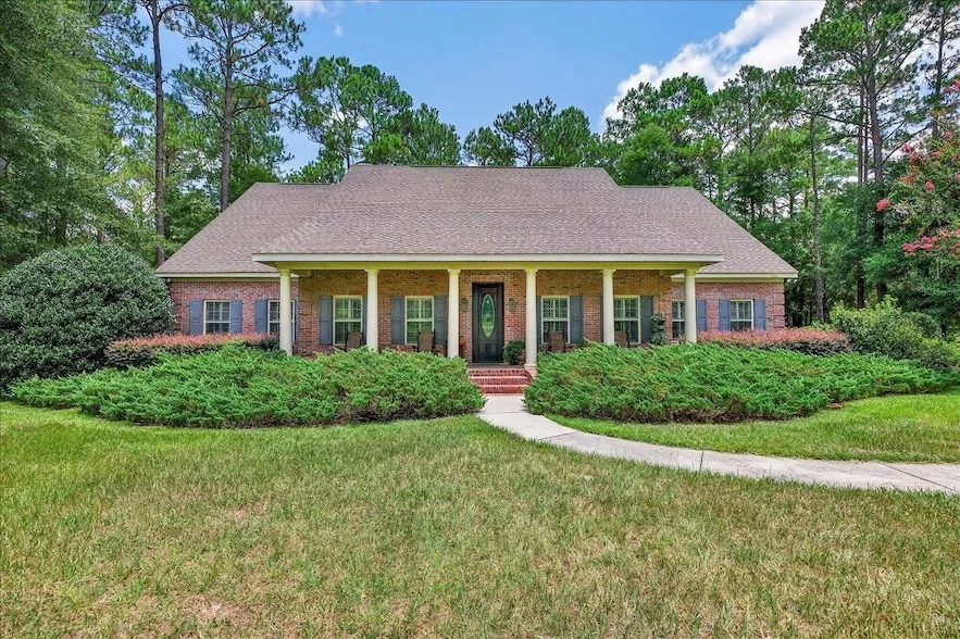 Discover timeless quality & serene living in this beautifully maintained, custom-built one-story all brick home. Nestled on 3+ peaceful acres, the home is only 13 minutes from Target. Step inside to find gleaming hardwood floors throughout, 10-foot ceilings & expansive rooms flooded w/ natural light. The floorplan includes 3 spacious bedrooms & 2.5 baths. The 3rd bedroom makes a wonderful home office. The stunning great room features a large fireplace & a wall of built-in bookcases. A charming sitting room offers a quiet retreat or reading nook. Enjoy cooking in a well-appointed kitchen w/ plenty of counter space & solid wood cabinetry, a built-in desk area & space for a kitchen table near large windows offering lovely views of the park-like property. Pick figs in your backyard or sip coffee on the covered front porch & watch the local wildlife - deer, turkeys, rabbits & songbirds. A large 3 car garage & ample driveway invites all your family & friends. A few steps from the neighborhood pond provides hours of fun for fishing or just connecting to nature. This one-of-a-kind property offers the best of both worlds: custom craftsmanship, modern comforts, & private natural beauty - all within minutes to shopping & dining. Schedule your showing during lunch so you can enjoy the famous sausage dog from Bradley's Country Store!!!