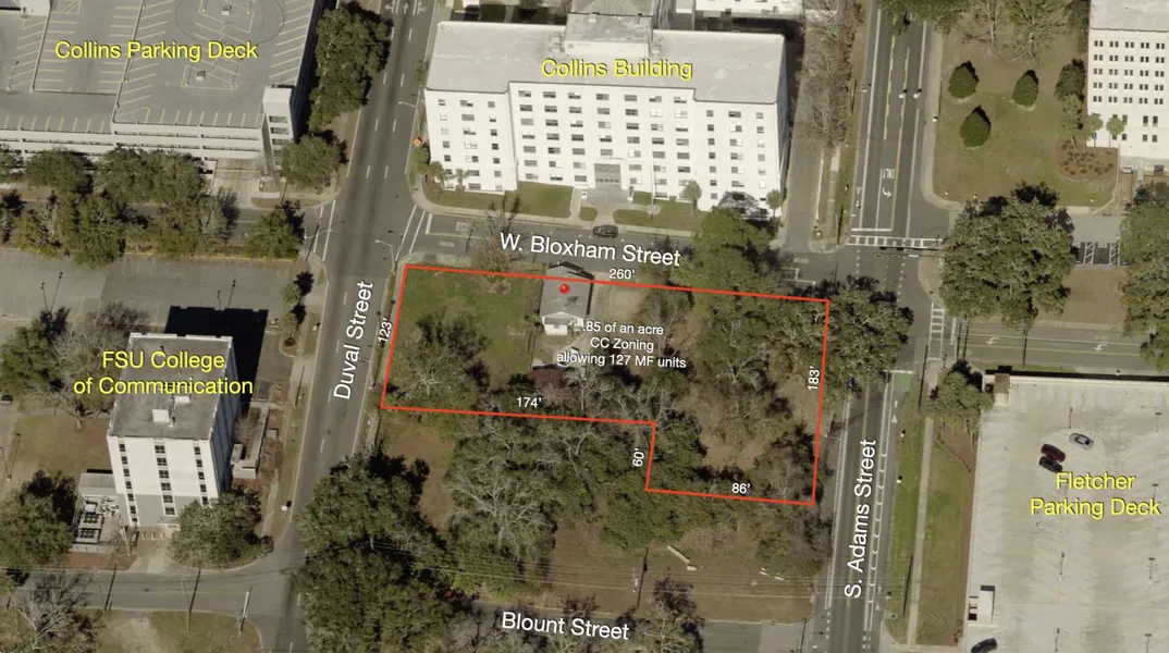 LOCATION DESCRIPTION - The property is located at 111 W. Bloxham Street in Tallahassee, FL. The site is ideally located across the street from the FSU College of Communications and the Attorney Generals office. The site has frontage on Adams Street, Duval Street and Bloxham Street. The site is located less than 1,200 feet from the new FSU College of Business, Cascade Park, and the Capital Building. It is less than 1,900 feet from Somo Walls, AC Marriott, Proof Brewing, FSU Law School, FAMU, and the Tallahassee Civic Center. It is 1 mile from Doak Campbell Stadium.