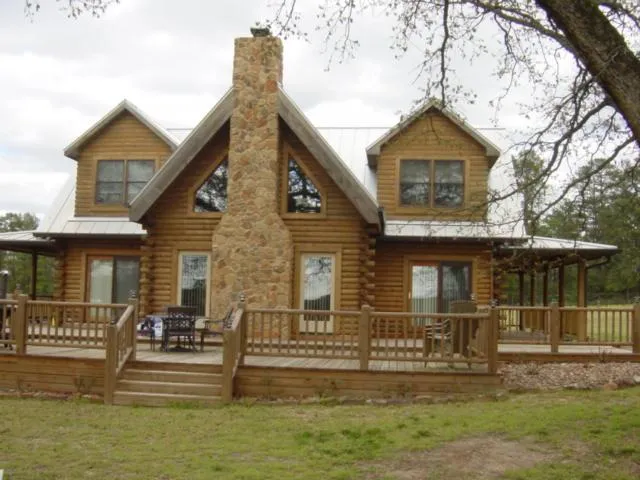 52 acres of lush green pasture, rolling hills with views, ponds and scattered woods. Beautiful 3-year-old custom built log house. Home has granite countertops, custom wood work, stainless steel appliances, stained concrete floors with Brazillian pecan wood floors upstairs. There are 3 bedrooms, 2.5 baths and a large living area with a cathedral ceiling. Outside is a covered porch and a huge multi-layer deck with firepit. Large 2-car covered carport/pavillion on a slab. This is the place you have been looking for! $499,500. REDUCED TO $450,000.