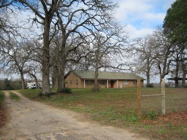 Large oaks surround this home. Four nice size bedrooms and two bathrooms, utility room, large living room with fireplace, dinning room, office, wood and tile floors, three year old Metal roof, fenced on two sides, 30'x40'pole barn, BISD,central A/C with propane heat, stove & hot water also propane, 240' water well for yard and Flo Community water, really nice screened in outdoor cooking porch.