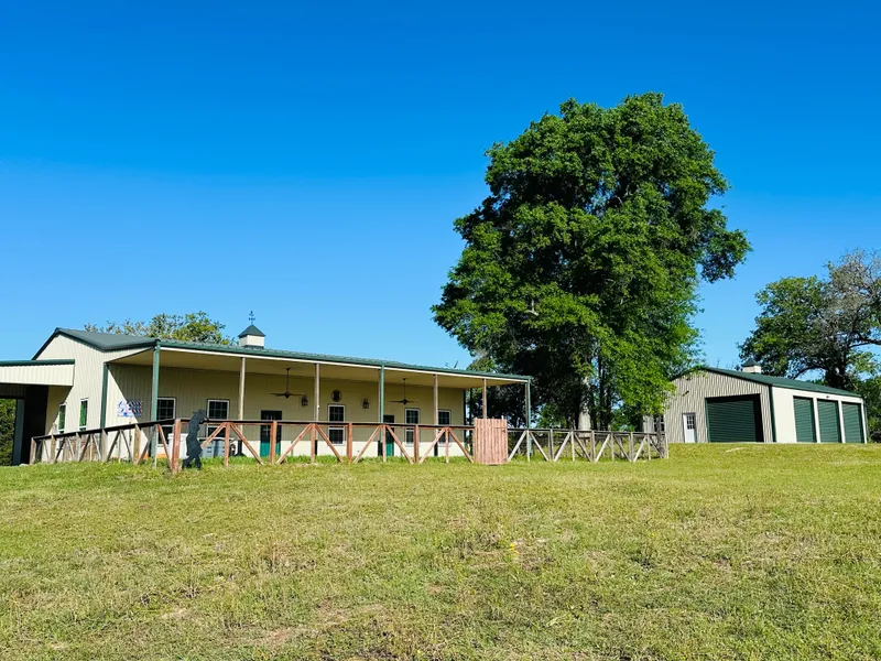 Buffalo TX 3 BED 2 BATH on 54+/-AC - Beautiful Property conveniently located between Buffalo and Centerville on Highway 75. This modern style bardominium sits atop a nice hill that overlooks the entance creating a pretty setting. The home has oversize bedrooms, living area and kitchen giving it a nice flow. The kitchen has custom cabinets, granite countertops along with stainless appliances. Outside of the home is a 3 Bay Shop that can be utilized as a garage or a workshop that also has a bathroom.