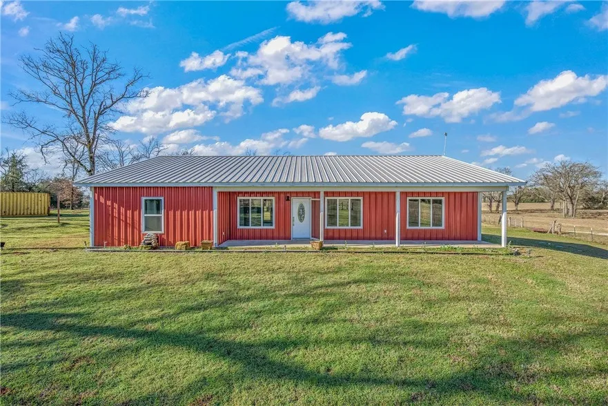 Welcome to this beautiful Barndominium-style home, nestled on 5.05 acres of land in the peaceful town of Jewett, TX. This spacious 3-bedroom, 2-bathroom home is the perfect blend of modern and rustic charm. As you step inside, you're greeted by a breathtaking living room with vaulted ceilings, creating an open and airy atmosphere. The kitchen boasts gorgeous granite countertops, specialty lighting, a walk-in pantry, a hands-free faucet for ultimate convenience. This home was designed with energy efficiency in mind, featuring spray foam insulation to keep you comfortable year-round. Smart home technology is integrated throughout, with app-controlled lights and air conditioning. Even every room has large walk-in closets! Step outside to discover covered front and back porches, each with ceiling fans to keep you cool while enjoying the fresh air. The property is equipped with water lines running across the land, ensuring easy access for gardening and animals. Speaking of which, the property includes an area ideal for a garden, two chicken coops, and a 40x50 pole barn, offering plenty of room for livestock, tools, or additional storage. This home includes an aerobic septic system, a tankless water heater, and a 40-amp RV plug for your recreational vehicle or guests! Two steel conex-containers with AC and electricity offer extra storage or workspaces, and the outdoor space is ideal for anyone looking for room to roam. This property truly has it all!