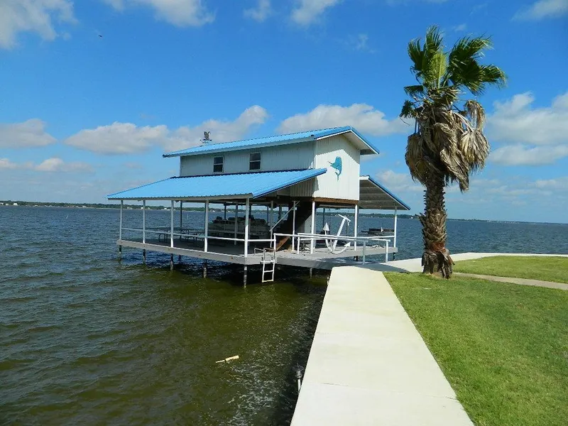 Unique-Quality-Custom-Desirable! This is a one of kind lake home with 9 ft ceilings; porcelain flooring; solid cedar beams in great room with vaulted ceiling; deluxe "chef's" kitchen with granite countertops; a prep island and a large island with seating; stacked stone surrounds the 8 burner, double oven Kitchenaid stove; In the family room there is a stacked stone surround fireplace with built shelves and seats with storage. Open Concept-Living-Dining-Kitchen. Built ins in many rooms, custom trim and more. Super sized garage with 320 SF guest apartment; Boat house with 2 lifts, upstairs game room; bulk headed water frontage with concrete sidewalks with LED lighting. To die for! outdoor kitchen with BBQ pits; fridge and fish fryer. Also, for your piece of mind there is a large "safe room" that is fire-proof and storm resistant with solid concrete walls/ceiling in the home, WAIT There's more- Call for complete list of amenities.