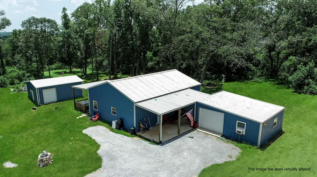 This quaint property offers a serene retreat, nestled within picturesque trees. Spanning 4 +/- acres on County Road 163, Centerville, this listing boasts a fully fenced perimeter ensuring privacy and security. The focal point is a delightful blue bardominium-style home. Designed with an open concept, the home has 2 spacious bedrooms. The kitchen and living area blend seamlessly together, creating a warm and inviting space with 9 ft ceilings that add to the airy feel. Included are several versatile outbuildings: 20x24 insulated garage with 1/2 bath, room for some bunk beds or game tables; 24x30 insulated shop with 2 functional spaces, perfect for various projects; multifunctional 10x12 insulated building equipped with electricity and window AC unit (imagine a home office or she/shed - man/cave). This offering is bursting with potential, whether you are looking for a primary residence with space for a garden, animals and children to explore or a weekend getaway complete with a bunkhouse and game room-utilizing the 24 x 30 shop to its max, the possibilities are endless.