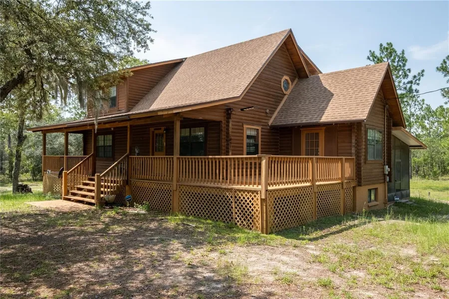 Welcome to your dream log cabin retreat! Nestled on 5 acres of pristine land, this property offers a unique blend of rustic charm and modern comfort, making it an ideal investment opportunity or home. Experience the allure of country living with this spacious 5-bedroom, 2-bath log cabin. Its cozy interior and serene surroundings make it the perfect escape from the hustle and bustle of city life. The partial wrap-around front porch adds a delightful curb appeal to the cabin, providing ample space for rocking chairs and creating a cozy spot to watch the sunrise or sunset over the sprawling 5-acre estate. Boasting a classic log cabin design, this home exudes timeless appeal and offers ample space to host family gatherings, vacations, or even generate rental income. The main floor of the home has an open floor plan concept with soaring vaulted ceilings, 2 bedrooms, and 1 bath. The second floor offers the primary bedroom and bath and a second living area loft that overlooks the first floor. In the basement, you will find 2 additional bedrooms, an office, laundry, and storage. On the backside of the cabin, you'll find a screened-in patio, an idyllic escape from insects, and a private retreat to enjoy Florida's pleasant weather all year round. For outdoor enthusiasts, Williston offers a myriad of recreational activities. From hiking and horseback riding in nearby state parks to fishing and boating in the many lakes and rivers, there's no shortage of adventures to embark on. History buffs will appreciate Williston's historical downtown providing insight into the region's rich past. If you're a fan of equestrian sports, Williston is renowned for its horse-friendly environment, hosts various equine events throughout the year, and is a quick 25-minute drive to the World Equestrian Center. Local farmers' markets and festivals celebrate the area's agricultural heritage, offering a chance to indulge in fresh produce and artisanal goods. With proximity to Gainesville and Ocala, you can easily access larger cities for additional entertainment, shopping, and dining experiences. NEW roof and HVAC in 2022!!! Don't miss this exceptional opportunity to own a piece of Williston's idyllic countryside and make this log cabin your own. Schedule a visit today and experience the magic of this charming property!