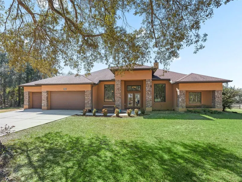 Exceptional farm set on 20 picturesque acres bordering the 75,000-acre Goethe State Forest. This farm is located in the sought-after equestrian community of Forest Ridge Trails, offering truly endless trail riding right from your doorstep. The beautiful block home sits atop a gentle hill, overlooking rolling green pastures and bathed in natural light from extra-large windows that frame the scenic views. Inside, the home features maple wood floors, all new appliances, and a wood-burning or gas fireplace for cozy evenings. A triple sliding glass door opens to the screened pool and jacuzzi area, creating seamless indoor-outdoor living. The stunning pool area includes a large deck, covered patio, and tranquil views of your horses grazing in the pastures. Designed for comfort and flexibility, the home offers a private guest wing with a living area, two bedrooms, a full bath, and a half bath...