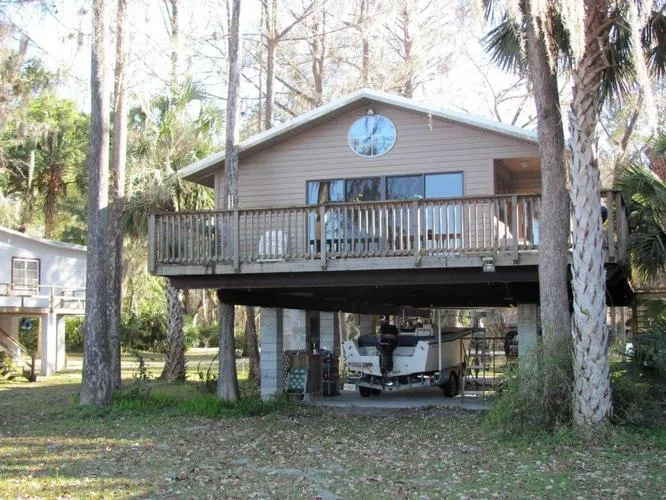 UNIQUE SUWANNEE RIVERFRONT WEEK-END RETREAT This well maintained home offers the feeling of an old time upscale cabin with custom wood features and charm throughout. Home was relocated and placed on steel beams on this 0.20 acre parcel. SPECTACULAR RIVER LOCATION with deep water. Shared boat house, one boat slip included in purchase, other boat slip belongs to neighbor. If you are looking for a true country waterfront property....welcome home!