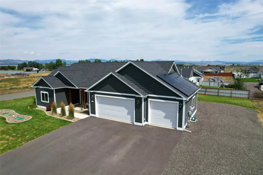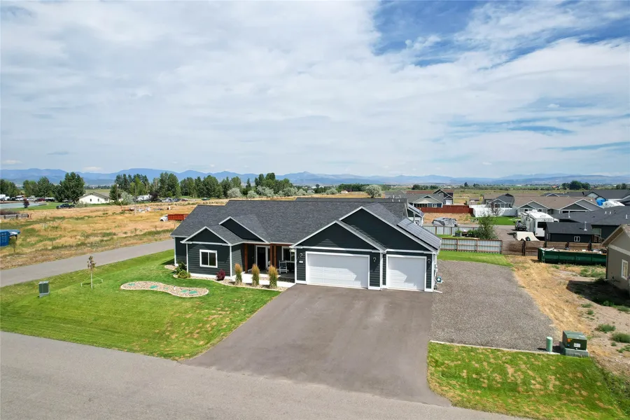 Built in 2022, this 2,085 sq ft home offers main-level living with quality features throughout. The open floor plan is centered around a cozy gas fireplace, with sound batt insulation for quiet comfort and central A/C for year-round climate control. Energy heel trusses enhance efficiency, while dual smoke/CO2 detectors and an active radon system provide peace of mind. The chef's kitchen and living areas flow seamlessly to an extra-large poured patio-perfect for entertaining-overlooking a fully landscaped .56-acre yard with underground sprinklers. The 3-car garage provides ample storage, and durable Hardie Board siding ensures low-maintenance curb appeal. This home combines modern amenities, thoughtful construction, and a prime outdoor space for Montana living at its best.