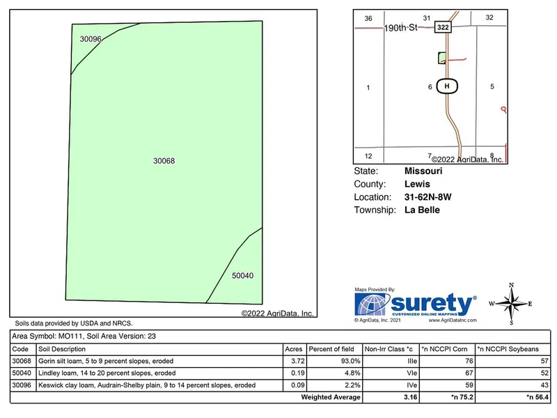 Land is located in Section 31, T62NR8W and Section 6, T61NR8W, Lewis County, MO.