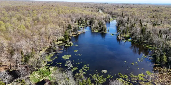 Several wetlands with varying levels of open water (depending on beaver activity) cover roughly 90 acres. A scenic 6-acre pond exists at the northwestern corner of the property.