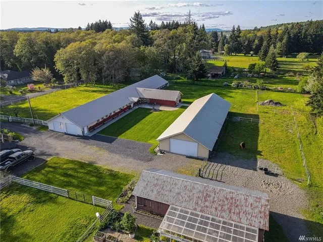 Well maintained unique property. Almost 10,000 sq ft of covered space. It includes 960 sq ft 1 bedroom, 1 bath living space plus 1200 sq ft entertaining room with 1/2 bath. 3 stall horse barn with tack room. Green house, garden space, fruit trees & berries. New well and 3 bedroom septic. All on 2 1/4 acres on Fords Prairie. Close to I-5