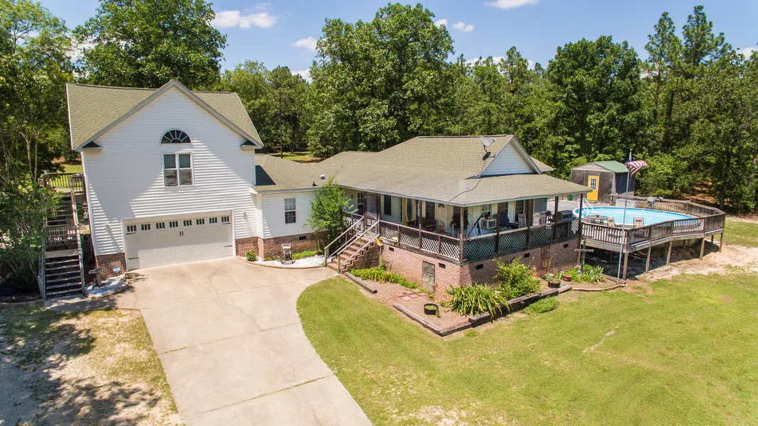 Private setting that is 1/2 mile off the paved road where you can watch the deer and turkey graze across front lawn. No neighbors in sight. Multiple sheds, above ground pool that has access off the master bedroom, Custom kitchen cabinets and wood flooring throughout. Room over garage has separate entrance, walk around deck and full baths. Home is being offered with 28 acres, more or less acreage is available.