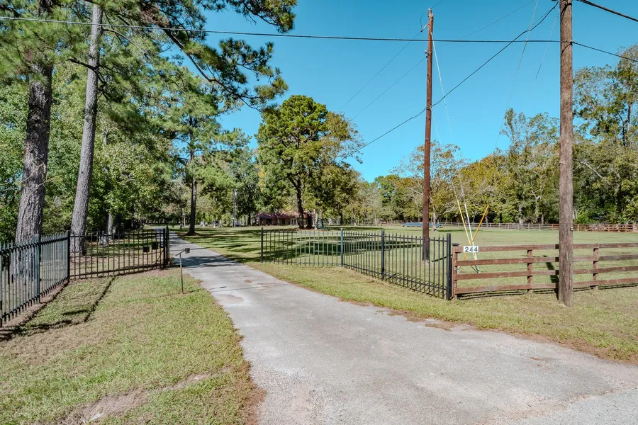 This Charming 3 bedroom 2 bath home is nestled among lovely mature trees throughout the well manicured landscape of this 4.73 acres of land. Property is fenced w/ gated entry and situated on high traffic FM 1010 (Plum Grove Rd). Features include a Cozy Family Room with Wood Burning Fireplace open to Kitchen/Dining Room w/breakfast bar, spacious Den with plenty of natural light, Primary Bedroom with Primary Bathroom w/ great designer finishes, nice sized Secondary Bedrooms & Bathroom, Laundry Room w/ ample cabinets as well as Hypoallergenic Tile Flooring throughout. Attached Carport and extra storage is a plus on the rear of the home. Property is located in proximity to the Cleveland Loop with easy access to Hwy 59 and Hwy 105. Site is ideal Residential or Commercial use.