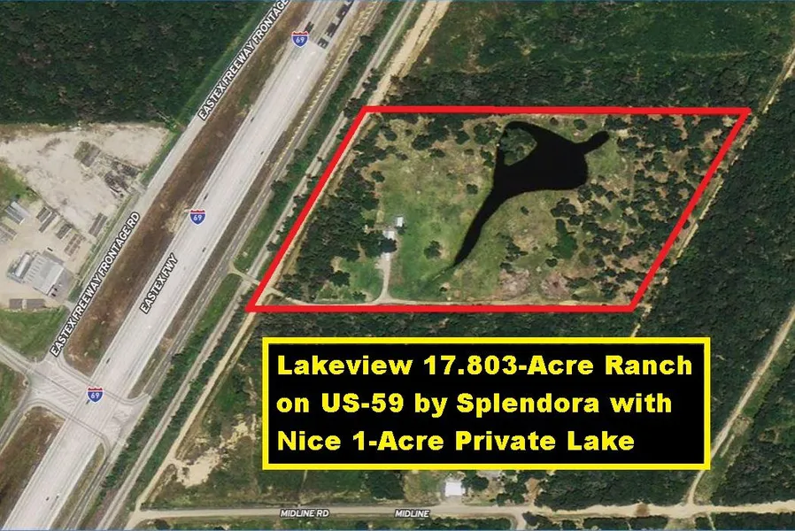 Lakeview 17.803-Acre Ranch on US-59 with nice 1-acre private lake by Splendora South of Cleveland & just 200 yards North of the Fostoria Road signal light. Property is fronted by the Union Pacific Railroad Tracks with visibility & access to US-59. Property consists of two tracts: 16.0289 Acres in Liberty County & 1.77 Acres in Montgomery County. Property has electricity, water well, septic system, small wood frame home & garage/shop being sold As-Is and contribute very little value to the property. Although property is not located in any city limits or have zoning regulations, it does lie in the Extraterritorial Jurisdiction (ETJ) of Splendora and development would need to comply with Splendora regulations. Quick access to the Grand Parkway/TX-99 only 10 miles away offers easy commute to Downtown Houston 30 miles away. Perfect location for RV Park, single family home development or nice horse property within 30 minutes to The Woodlands, Bush Intercontinental Airport & Lake Houston.
