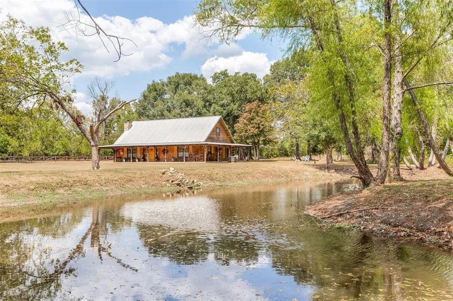 Come home to your own little piece of heaven on earth! As you approach this hidden gem, you'll feel that sense of peace and an awareness that this place is special. The log home is so charming with its full wrap-around porch and lifetime metal roof, and when you step inside, you'll feel like it's Christmas everyday surrounded by the warm ambience of real wood! And as you sip your coffee by the pond, hearing only the leaves rustling, birds chirping and other sounds of nature, you'll breathe easy and relax, knowing that this home is yours. There's almost 5 acres to create your own field of dreams. A slab is already in place if you want to rebuild a barn there and bring your animals. The covered carport could serve any number of functions, including a summer kitchen if you choose. You'll find room to roam with the freedom to create! In 2020, the seller installed a full new 5-ton A/C system (including ductwork) and beautiful exterior doors. Propane tank serves only the generator.