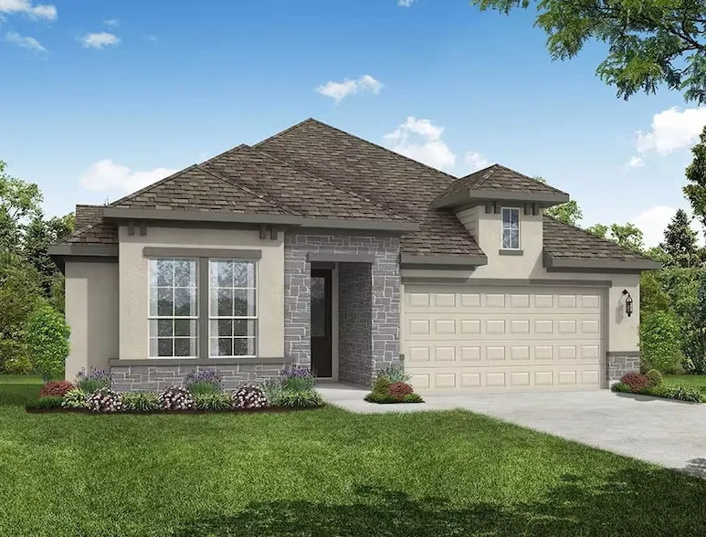 **McKinley Homes Kyle Plan** 1,738 sq. ft. One Story 3 Beds, 2 Baths. This charming one-story home features a stone and stucco exterior, an extended covered patio, and tile flooring in the living areas. The open-concept island kitchen includes a 10-inch deep under-mount stainless steel sink, tile backsplash, built-in gas cooktop, and a cabinet with a microwave and oven. The spacious living room has a vaulted ceiling with faux wood beams, while the primary bathroom offers an oversized spa shower, dual vanities, and a walk-in closet.