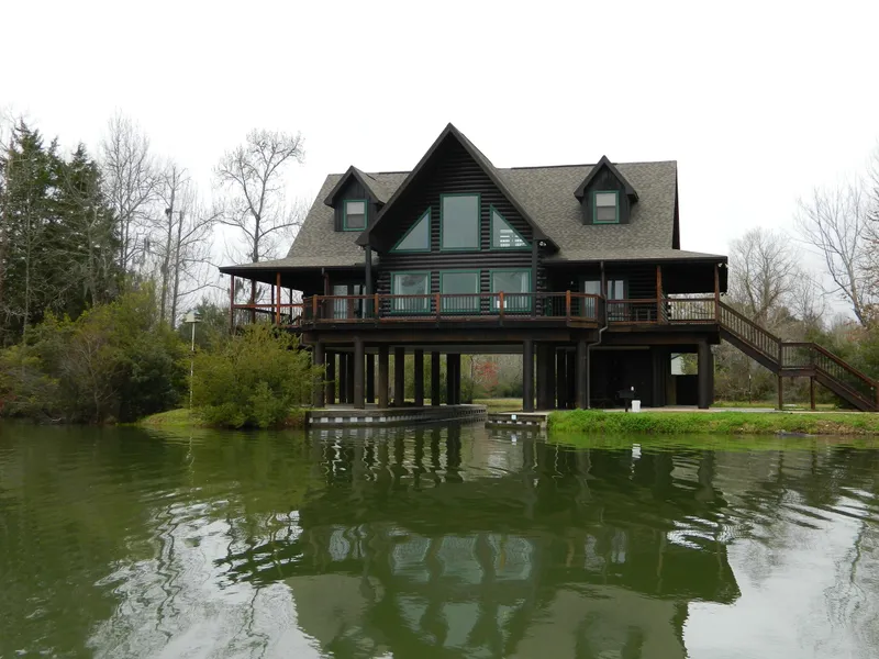 Luxurious waterfront log home-Vista Del Lago. Nestled in gated, nature loving, wooded community with multiple lakes. Decks. Gorgeous views. Boat passageway/dock/patio areas under house. Private island. Two staircases. Fully furnished. Fireplace & stone welcome you. Spacious, open concept includes loft overlooking huge family room, dining room & large island kitchen. Enormous windows. Large bedrooms-each has a bath. Fishing,hiking,canoeing,amenities at Resort of Artesian Lakes. Delightful dream!