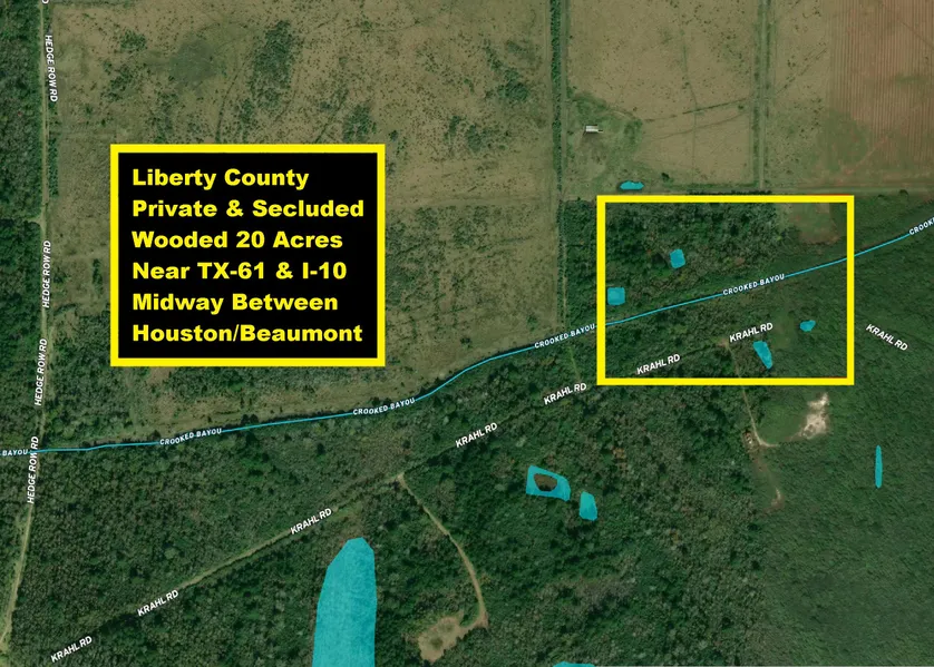 Liberty County private & secluded 20-acre tract near TX-61 & I-10 about midway between Houston & Beaumont. The property is heavily wooded and bisected by Crooked Bayou. Recorded Right Of Way for oil companies known as Krahl Road. Roads leading to property off of Hankamer Loop are oil company right of ways that can be used by landowners per the recorded document. There is no guarantee of future use and parts of the road are not maintained. Four wheel drive will be needed in wet weather. The land is located 5 miles NE of Hankamer, 13 miles South of Devers, 6 miles North of I-10 & 3 miles East of TX-61. The property has a 45-mile Interstate commute to Beaumont or Houston. The property has no known Deed Restrictions and is not in any Citys limits. Research into area Codes and Restrictions will be the responsibility of the buyer. The land is in Zone AE of the FEMA Floodplain Map. Seclusion & ...