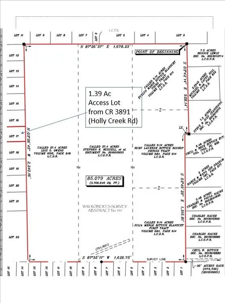 LAND FOR SALE CLEVELAND TX 85.079 acres Unrestricted & Ag Exempt 341 County Road 3891 N, Cleveland TX 77328 (Holly Creek Drive). Includes a 1.38 acre subdivision tract for access to County Rd 3891 and 30' easement to County Rd 386. Development opportunity (subdivision tracts located to the North, South and West). Amenities Include: Mixed timber (oak, pine, magnolia_some very mature). Plenty of wildlife. Creeks running along North and East portions of the property. Located only 2 miles from Hwy 105 & I-69 intersection. Only 16 miles to Grand Parkway. 26 miles from Bush Intercontinental Airport.