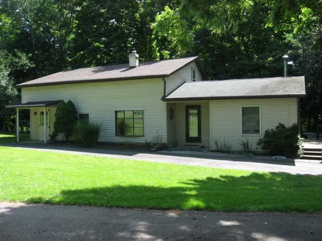 The long mostly-paved driveway leads to this private retreat surrounded by woods! Circular drive leads to the entry that looks into the living room or kitchen. The living room is very large and has French doors opening to the beautiful shaded deck, and a woodburning stove. The eat-in kitchen with peninsula and good counter space has a bright dining area that looks out to the yard through a bow window. The dining room/den is a great spot for your formal table, or for computers or easy chairs and books. Laundry/mudroom with its own entrance is off the kitchen. Full bath with cedar finishes is on the first floor, as is one bedroom. Two more bedrooms are upstairs. One bedroom has extra storage space, and the other can accommodate bunk beds in the alcove. Detached two-car garage has a pellet stove – making it a good year-round work space. This is a beautiful spot in the country!