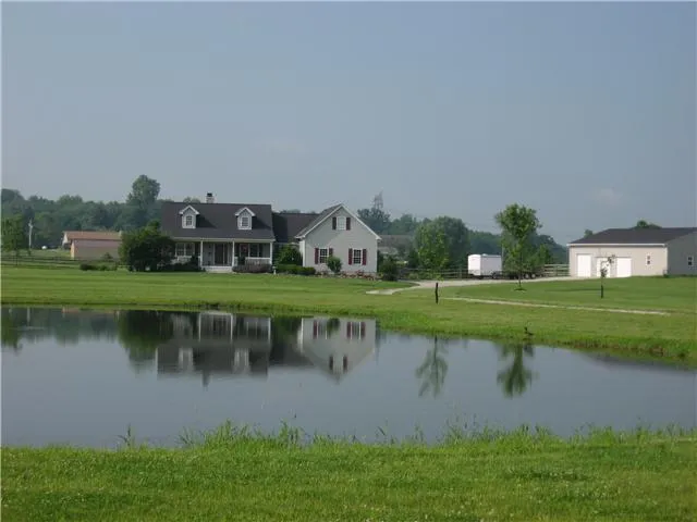 It’s a nice journey to and from this well-built home: come down the quiet road, drive past your own stocked pond every day, watching for ducks or herons that happen by! Spend time on the front sittin’ porch; then, come inside. The gracious entry opens to the dining room, and to the great room with cathedral ceiling and stone-faced fireplace with wood storage bin. The oak kitchen has all appliances, including a double oven. A high knee wall keeps kitchen preparation out of sight, but allows for an open, spacious floorplan. Wood floors are throughout the first floor common areas. Off the kitchen are French doors leading to the composite deck and fenced yard area. The full owner’s suite is very bright, has a full bath with spa tub and walk-in closet. On the other side of the house are two more bedrooms and a full hall bath. Upstairs is a family room and another bedroom. The laundry/mudroom off the kitchen leads to the 2 1/2 car garage with openers. The full lower level has an extra-height ceiling, and is laid out to be a fantastic rec room. The 32x56 outbuilding is insulated, has 100 amp electric service, three bay doors, and concrete floor. The homestead is set well back from the very quiet road to the front, and the rear property line to the back. This home has been very well looked-after, ready for you to move in!