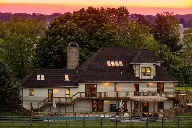 Enjoy rolling views of the countryside from the top of Burg Street in Granville, OH on this 26 Acre Equestrian Estate! 20m X 40m indoor riding arena, clear span ceiling, many windows, Orion Lights, footing treated so NO watering required! 2nd story viewing loft and enclosed lounge. Large outdoor, lighted sand arena that will accommodate dressage ring or stadium jumping (Over 70' x 140'). Stables feature 10 12x12 stalls, each w/private paddock. Most have direct access to field turnout and are adjustable for foaling. Wash stall with hot and cold water, heated feed/tack room with private tack lockers, and wash sink with hot and cold running water. Ground floor attached hay/bedding/equipment barn which could be converted to more stalls. Separate pole barn for parking horse trailers, tractors, trucks, and golf carts. 5 run in shelters in pastures, 3 of which have feed/tack rooms. 4 rail perimeter fencing and cross fencing w/ additional electric rope cross fencing, established hay field, numerous trails, wooded creek on property. Within minutes of Granville Schools and Village amenities! House features multi-level living spaces, with LOADS of natural lighting. Inviting outdoor living area w/ 20x40 pool, pergola, seating areas, gas fireplace and BBQ. 2 Main floor masters with 2 additional bedrooms upstairs, as well as 2nd floor den and spacious viewing lounge. Large bright custom oak kitchen with Corian counters and walk-in pantry. Lower level is home to billiard room, full bath, spacious family/exercise room and large mud room. Family room and Mud room both walk out to pool. New roof in 2014 new furnace & A/C in 2013, new in-line water heater in 2012. Pool and home heated with free gas from income producing on-site gas well. 3 bay detached garage with extra large center bay is home to a full bath, laundry, separate workshop/tool storage room with easy attic access. There is so much more to see for yourself! Do not miss your chance to own this piece of paradise!