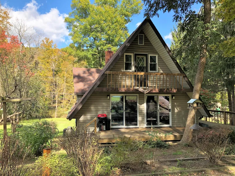 Unique living in Granville! This 3 bedroom A-Frame home sits on 1.18 acres in Granville Township. Relax on the front porch or back deck & enjoy this country neighborhood in Granville School District. 1,400+ sq. ft. The main floor features a relaxing living room with great views of wildlife in the tree covered front yard. A dining area leads into the kitchen. Large main floor master bedroom & big bathroom. There are two upstairs bedrooms with great views. One has a balcony that overlooks the front yard, & the other has a great view of the backyard. The finished walkout basement has a family room and a rec room with a wood burning stove. There's also a utility area for storage. The 2 car garage has a workshop/storage area. A foot bridge crosses the creek into the back of the property.