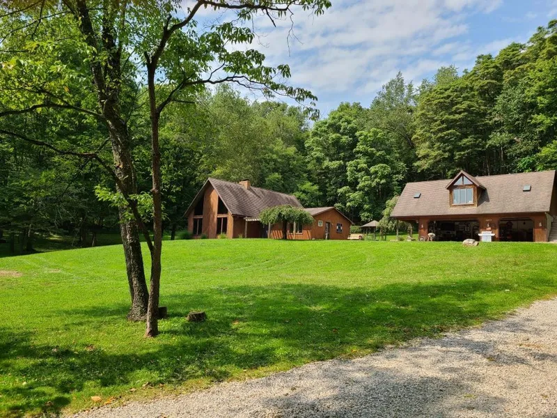 Secluded 6 acres with much of it wooded! Detached 3 car garage convenient to main house. Wonderful 960 sq. ft. apartment with deluxe kitchen.above the 3 car garage! Main house boasts cathedral ceiling in great room, w/ floor to ceiling fireplace! Updated kitchen is open to dining area + a casual dining area in the kitchen. Two bedrooms on main level, large bedroom up with balcony. Jack and Jill bath. House bathroom count is 1.5 due to Jack and Jill set up. Great outdoor living spaces with deck, gazebo, and covered porch. Shared driveway. The apartment was last rented for $1,400 per month for a year ending August 2020. Apartment bedroom is upstairs with deck behind. It has a full shower bath. Also great for extended family. House sq ft 2278 finished space above garage 960.