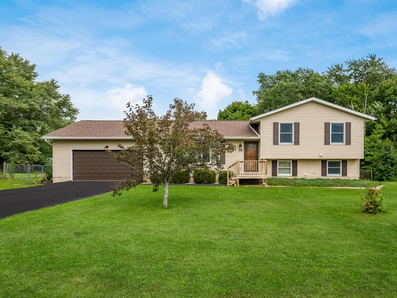 Nicely updated home on over 1 acre. So much to love in this floor plan. Large formal living room. A cook's dream with center island. Dining area opens onto the deck, complete with new awning, and overlooks the tree lined yard. Upstairs you'll find 3 nicely sized rooms, and a newly renovated bath, complete with spa-like shower. The lower level features a family room with patio walk-out, and a second full bath with a jacuzzi tub. The utility room has lots of extra space for additional storage. The oversized 2 car garage is well-appointed with built-ins, a sink, and heater. New roof 2022 and New Driveway in 2018. The sprawling yard and ideal location are perfect compliments to a great home, adding to the serenity & privacy. List of updates within documents.