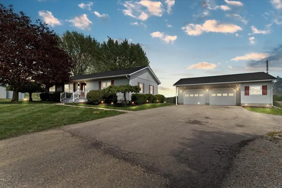 Welcome to this beautifully maintained 3-bedroom, 2-bath ranch nestled on 1+ acre with over 2,000sqft of living space. This move-in-ready home features an open-concept living room with a spacious kitchen that flows seamlessly into the dining and living areas. Step out onto the back deck and enjoy peaceful views, or relax on the concrete patio surrounded by farm land. The finished basement offers fantastic bonus space, including a theater room, storage/laundry area, gun/safe room, and a separate utility room housing the HVAC, water softener, and well pump systems. Updates abound throughout the home, including remodeled bathrooms (2020 & 2025), newer flooring, and a new roof in 2021. Hobbyists will love the oversized 2.5-car detached garage and additional concrete parking pad perfect for a camper or RV. Two powered storage sheds provide even more room for tools, toys, or outdoor gear. Othe...