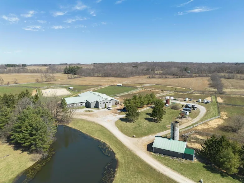 Stunning 82-acre equestrian estate with a 70' x 120' mirrored indoor riding arena with 14 spacious stalls, office space, bathroom, and elevated observation room. Secondary 7-stall pole barn, spacious 2-stall mare and foal barn, and an expansive 100 x 200 ft outdoor sand arena. Versatile training grounds including water elements, bank and ditch complexes, and a variety of natural and portable solid jumps scattered across partially wooded terrain, along with beautifully maintained bridle trails. A refined timber-beamed farmhouse featuring 3 bedrooms, 3 baths, and an inviting wraparound porch, perfectly positioned to offer stunning vistas. Detached 3-Car garage with studio apartment and a picturesque stocked pond, while 40 acres of productive farmland complete this idyllic estate.