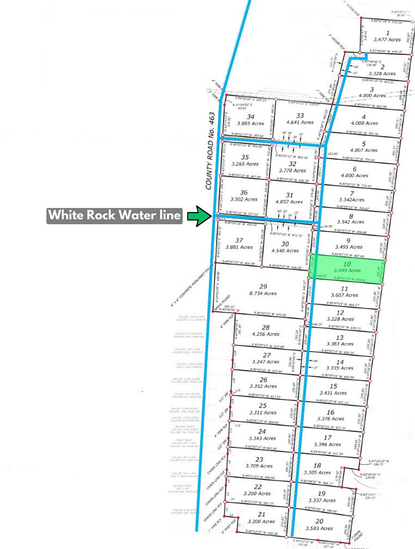 Contact White Rock Water Supply. Water Lines and Meters are being planned and will go out for bidding shortly. Access runs along the private road. Meter Tap fees are modest plus any minor connection and connection fees for new property owners.