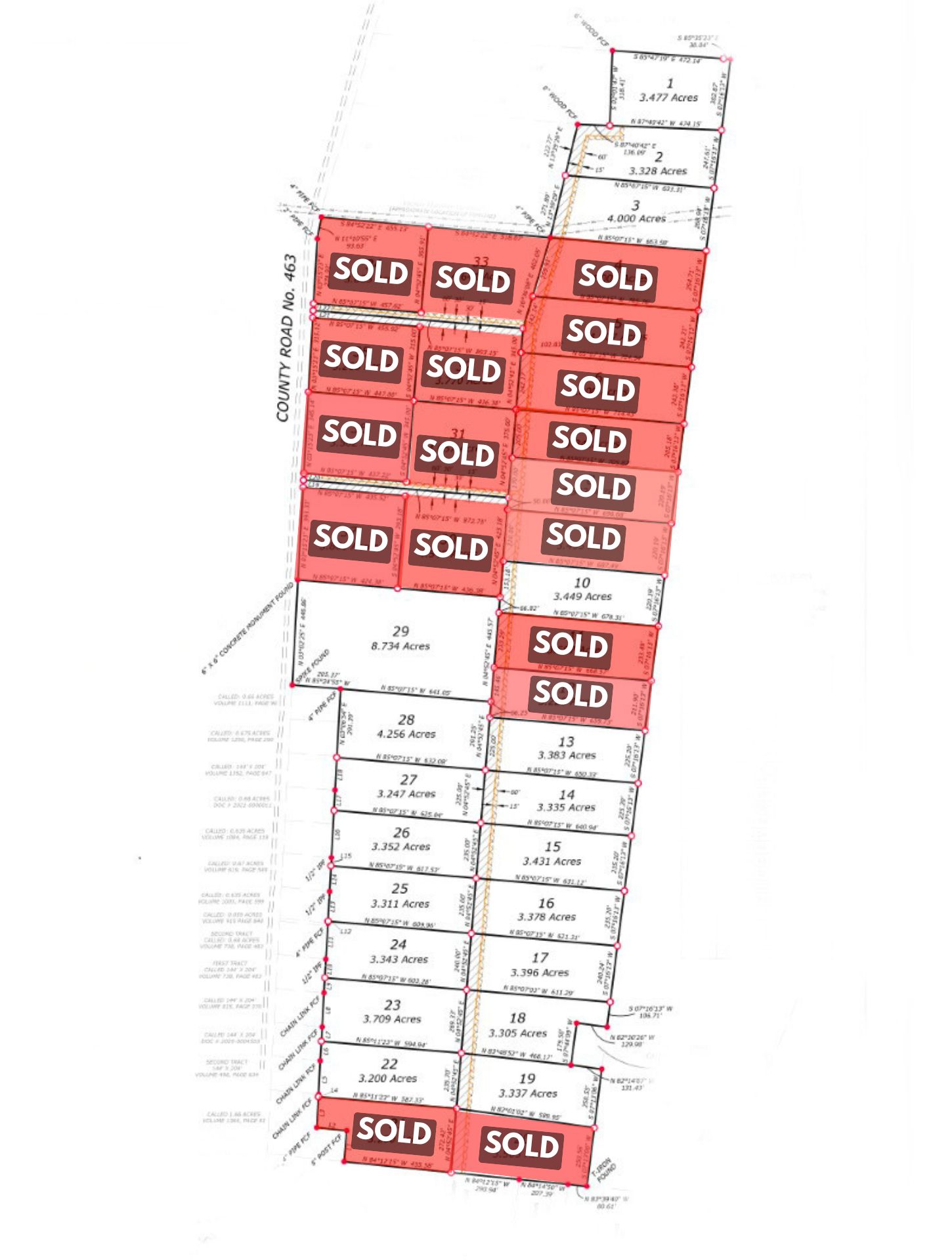 2 Private-Gate Entrances from CR 463. Newly Engineered 6,200′ Private Road established with 8" of limestone screening subgrade and 4" road base top all excavated, graded and machine compacted. Set with drainage channels on each side of the road. Ready for home construction traffic and weight. Culverts set at drainage points to guide the flow of water.