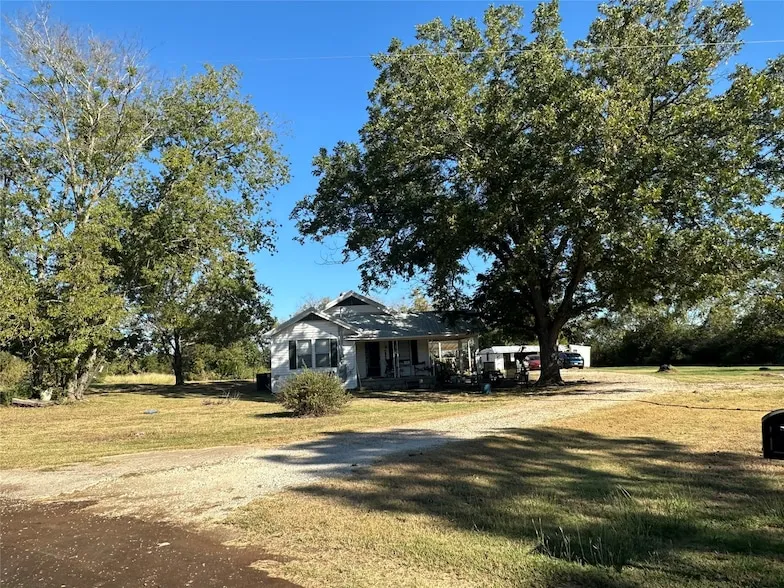 Escape to the Country - Farmhouse on a Quiet Country Road. Enjoy the evening breeze on your covered front porch shaded by large producing pecan trees. Step inside to a large living and dining area with plenty of room to enjoy family time. Retire for the night in 4 bedrooms with closets. The 4th bedroom or flex room is a converted back porch with exterior door to a covered carport or patio area. This room also has an ensuite full bathroom and the utility area for washer and dryer. The front bedroom has 2 closets. There is a kitchen in the center of the house with a double oven, microwave with vent, dishwasher, large farmhouse sink, refrigerator, original wood cabinets, and renovated granite countertops and tile backsplash. Outside there is plenty of privacy with 1.6 acres, a small pond in the back corner of the property, 2 chicken coups, fenced garden area, 2 car garage, and storage building. There is even a pad and electric hookup in place for an RV or tiny home. With a separate electric meter and sewage hookup this space could be rented for extra income. The septic system, plumbing, electrical and the HVAC are new.