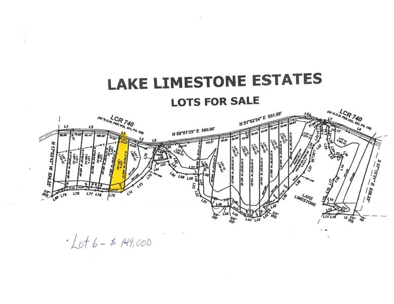Lot 6: A 1.017 ac lot in new subdivision on West side of Lake Limestone. Partially cleared waterfront lots. Electricity available. Conveniently located near Running Branch Marina.