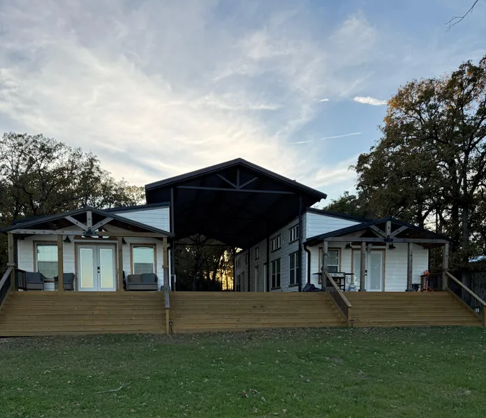 Discover your lakeside sanctuary on 3.868 stunning tree-covered acres at Lake Limestone. This exceptional family compound features two beautifully appointed 1200 SF cabins connected by an impressive 66 x 20 covered deck, creating the ultimate entertaining space. The main cabin offers a primary suite with full kitchen, living area, bedroom, bath and laundry, while the guest cabin provides 3 bedrooms, 2 baths, a spacious living area and kitchenette. Both cabins feature private lake-facing porches and separate entrances, perfect for family gathers or rental income potential. Located in the most accessible area of Lake Limestone, just west of the FM 3371 bridge with easy access via LCR 773. The public boat ramp is just around the corner, and you are just a short drive to Old Union. Enjoy wide open calm waters and endless lake days in the turnkey retreat.