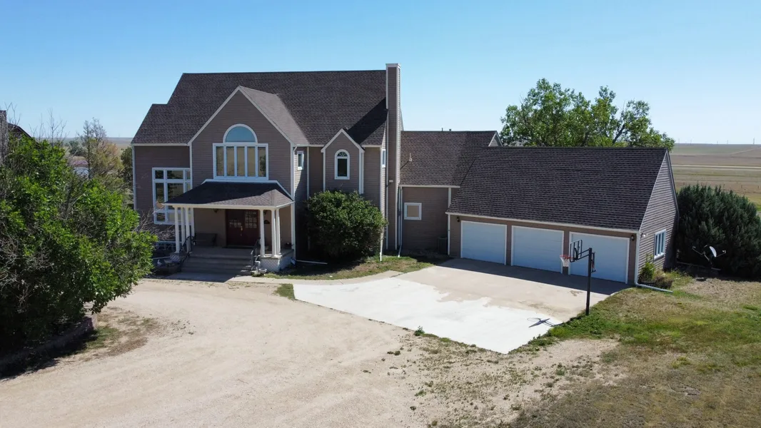 Standing tall, this beautiful home has a presence in its small town. An abundance of towering floor-to-ceiling windows overlook the eastern plains. Boasting 4 generously sized bedrooms, 3 living spaces, both formal dining and casual dining areas, 4 bathrooms, a home/library, a large sunroom that can function as an additional office, a workout space, 2 bar areas and a beautifully updated kitchen with marble countertops.